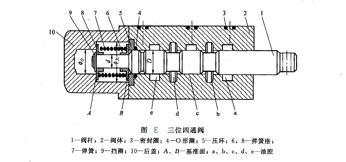 ①方法I 將有問題的閥片拆下,洗凈,畫出閥片內(nèi)孔各油槽的相對位置簡圖(見圖E),找到閥桿在閥片中中立位置的基準(zhǔn)且標(biāo)在簡圖上,再測出閥桿油槽的精確位置和寬度并在簡圖上標(biāo)出,然后通過計算或?qū)㈤y桿的幾個工作位置在簡圖上逐一畫出,但必須精確,這樣就可以找到閥桿移動時所控制的進(jìn)、出油口在瞬間不能同步的位置。在閥桿上標(biāo)出這個位置后用磨床或車床將有問題的回油槽稍微加寬一點(diǎn)即可,即將回油槽一側(cè)(邊)閥桿上阻擋回油的肩頭處倒30°或45°角,倒角軸向邊長應(yīng)根據(jù)尺寸計算決定,切不可過大,否則將造成換向閥不能使用。根據(jù)經(jīng)驗(yàn),倒角邊長尺寸為0.5mm左右,最大也不能超過0.8mm。如沒有機(jī)床,在轉(zhuǎn)動比較平穩(wěn)的砂輪機(jī)上也可以完成這項(xiàng)工作。