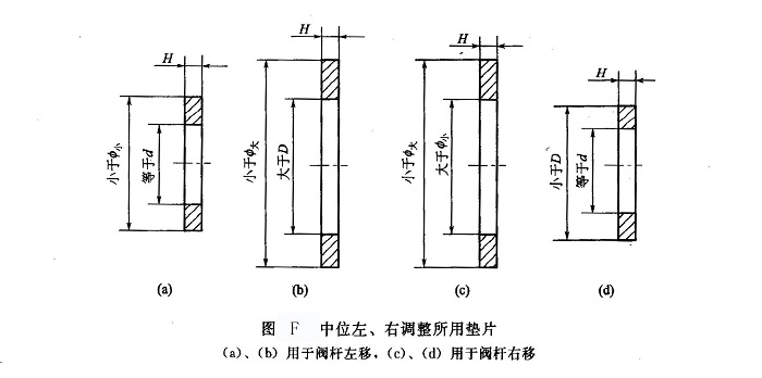 ②方法Ⅱ 若認(rèn)為采用方法I不便,可采用加圓墊片的方法確定閥桿倒角的準(zhǔn)確位置(見圖F)。預(yù)先加工出厚度分別為0.5mm和0.8mm的兩組圓墊片,每組一大一小共兩個,大墊片用來移動閥桿,小墊片用來防止閥桿竄動。用于左移的大墊片內(nèi)徑略大于閥桿直徑D,外徑略小于或等于圖E中后蓋10的內(nèi)徑廬大;小墊片外徑略小于圖F中后蓋10的里端內(nèi)徑聲小,內(nèi)徑等于或略大于閥桿前端直徑d。如欲將閥桿中立位置左移,就將大墊片墊在彈簧座B基準(zhǔn)面后面,小墊片墊在彈簧座基準(zhǔn)面A后面(這樣,閥桿的中立位置就會左移,而閥桿仍能保持左右沒有自由竄動量,如果只墊大墊片,閥桿就會有自由竄動量);如欲將閥桿向右移動,就將大墊片墊在彈簧座基準(zhǔn)面A后面,將小墊片墊在彈簧座基準(zhǔn)面B后面,這樣,閥桿的中立位置就會向右移動。每次加裝墊片后(左、右移動各有2種厚度的墊片,共有4種狀態(tài))均須裝機(jī)試驗(yàn),最多4次就能找出閥桿上油槽阻礙低壓回油處(對應(yīng)a腔或b腔);然后,對阻擋回油的軸肩處進(jìn)行如同方法工那樣的倒角處理即可,但倒角后切不可忘記將所加的墊片取下來;如果加墊片后,閥桿的動作正常,可暫時使用。