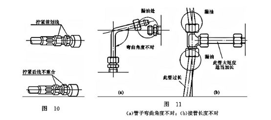 (2)由于管子的彎曲角度不對(duì)[見(jiàn)圖11(a)],以及接管長(zhǎng)度不對(duì)[見(jiàn)圖11(b)],管接頭擴(kuò)口處很難密合,造成泄漏,其泄漏部位如圖所示。為保證不漏,應(yīng)使彎曲角度正確和控制接管長(zhǎng)度適度(不能過(guò)長(zhǎng)或過(guò)短)。