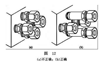 (3)接頭位置靠得太近,不能擰緊,有干涉。在若干個(gè)接頭靠近在一起時(shí),若采用圖12(a)所示的排列,接頭之間困靠得太近,扳手因活動(dòng)空間不夠而不能擰緊,造成漏油。解決辦法是拉開(kāi)管接頭之間的距離,不行的話可按圖12(b)中的方法解決,可方便擰緊,便于維修。