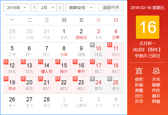 1. 2018年2月11日(農(nóng)歷臘月二十六)到2018年2月23日(農(nóng)歷正月初八)期間春節(jié)放假,共計13天。2018年2月10日(農(nóng)歷臘月二十五、星期六)上班,2018年2月24日(農(nóng)歷正月初九、星期六)上班,2018年2月25日(農(nóng)歷正月初十、星期日)上班。
