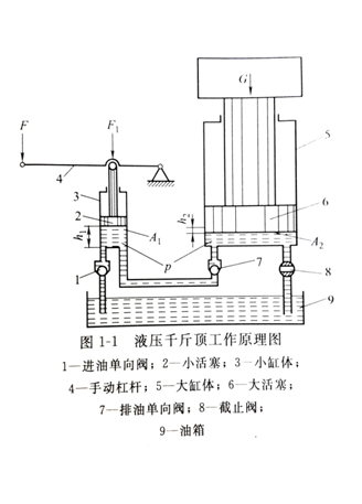 根據(jù)流體力學(xué)中的帕斯卡定律 “在密閉容器內(nèi),施加于路上液體上的壓力將以等值同時傳到液體各點(diǎn)”,若要頂起重物,則在小活塞下腔就必須產(chǎn)生一個等值的壓力p,即小活塞上施加的力F1,為