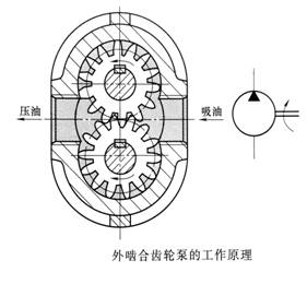 如右圖所示為外嚙合齒輪泵的工作原理。一對參數(shù)完全相同的外齒輪安裝于殼體內(nèi),并且每個齒間都形成一個密封的工作容積。當(dāng)齒輪按圖示方向轉(zhuǎn)動時,輪齒從右側(cè)退出嚙合,露出齒間,使該腔容積增大,形成局部真空,油箱中的油液在外界大氣壓的作用下,經(jīng)吸一油管進(jìn)入吸油腔;完成吸油過程。隨著齒輪的轉(zhuǎn)動,每個輪齒的齒間把油液從右腔帶入左腔,輪齒在左腔進(jìn)入嚙合,使密封容積減小,齒間中的油液逐漸被擠出,使左腔的油壓升高,油液從排油口輸出,完成壓油過程。兩齒輪連續(xù)轉(zhuǎn)動,吸油腔就連續(xù)吸油,排油腔就連續(xù)排油。