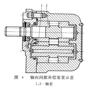 在中高壓齒輪泵中,為了減小軸向間隙泄漏,通常采用浮動軸套或彈性側(cè)板對端面軸向間隙進(jìn)行自動補(bǔ)償。圖B所示是采用浮動軸套的一種典型的結(jié)構(gòu)。圖中軸套1和2是浮動安裝的,軸套的左側(cè)容腔用特制的通道與泵的壓油腔相通。當(dāng)泵工作時(shí),軸套1和2受左側(cè)油壓的作用右移,貼靠在齒輪的端面上,壓力越高,貼的越緊,從而可以減小間隙并自動補(bǔ)償端面磨損量。實(shí)踐證明,這樣能取得較好的效果。