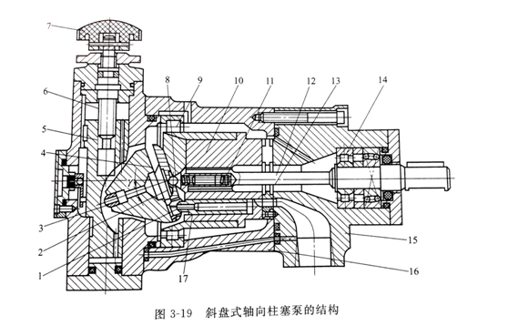 如圖3-19所示為常用的一種斜盤式軸向柱塞泵的典型結構,它可分為兩大部分:右邊的主體部分和左邊的變量部分。