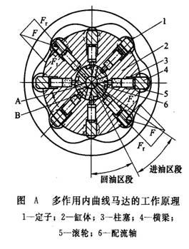 圖A所示為多作用內(nèi)曲線馬達(dá)的工作原理。定子1的內(nèi)表面由x段形狀相同作均勻分布的曲面組成,曲面的數(shù)目x就是馬達(dá)的作用次數(shù)(本例X=6)。每一曲面的凹部的頂點(diǎn)處分為對稱的兩半,一半為進(jìn)油區(qū)段(即工作區(qū)段),另一半為回油區(qū)段。缸體2有z個(gè)(本例為8個(gè))徑向柱塞孔沿圓周均布,柱塞孔中裝有柱塞3。柱塞頭部與橫梁4接觸,橫梁可在缸體的徑向槽中滑動(dòng)。安裝在橫梁兩端軸頸上的滾輪5可沿定子內(nèi)表面滾動(dòng)。在缸體內(nèi),每個(gè)柱塞孔底部都有一配流孔與配流軸6相通。配流軸是固定不動(dòng)的,其上有2x個(gè)配流窗孔沿圓周均勻分布,其中有x個(gè)窗孔A與軸中心的進(jìn)油孔相通,另外x個(gè)窗孔 B與回油孔道相通,2x個(gè)配流窗孔位置又分別和定子內(nèi)表面的進(jìn)、回油區(qū)段位置一一相對應(yīng)。