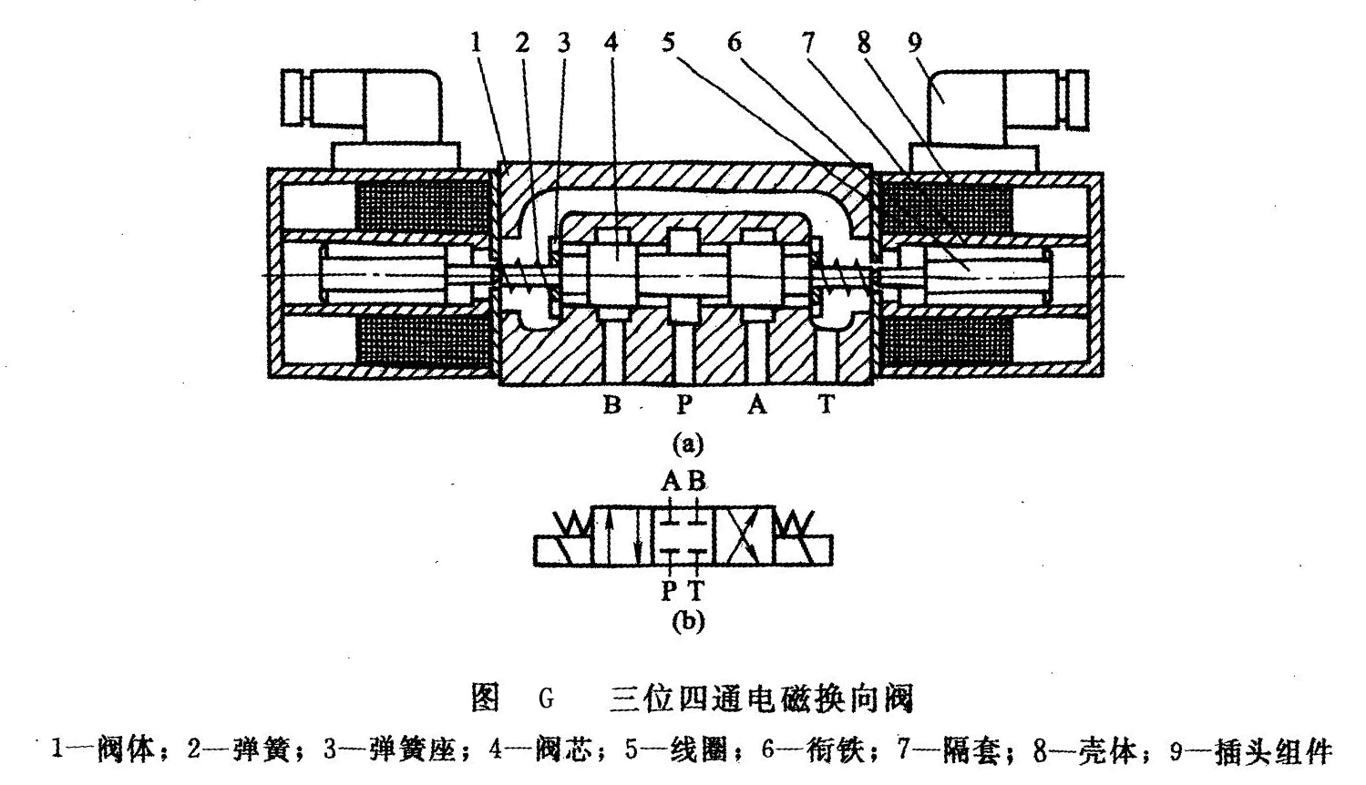 圖G所示為三位四通電磁換向閥的結(jié)構(gòu)原理和職能符號。閥的兩端各有一個電磁鐵和一個對中彈簧,閥芯在常態(tài)時處予中位。當(dāng)右端電磁鐵通電吸合時,銜鐵通過推桿將閥芯推至左端,換向閥就在右位工作;反之,左端電磁鐵通電吸合時,換向閥就在左位工作。