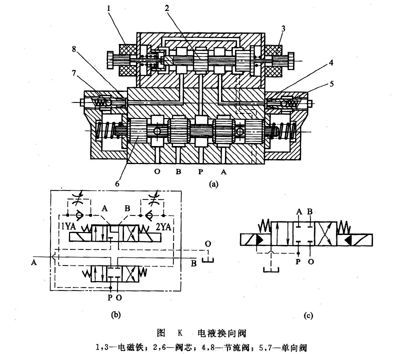 圖K(b)和(c)分別為電液換向閥的詳細職能符號和簡化的職能符號。