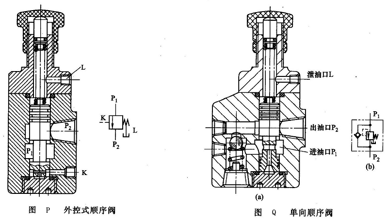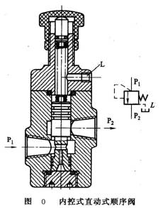 (1)內(nèi)控式 圖O所示為內(nèi)控式直動式順序閥。從圖中可以看出,直動式順序閥與直動式溢流閥相似,其主要差別是:順序閥的出油口連接到系統(tǒng)中的其他壓力回路,以操縱另一個液壓缸或其他元件的動作,而溢流閥的出油口直接連接油箱;順序閥的泄漏油單獨接油箱(外泄方式),而溢流閥的泄漏油則經(jīng)閥的內(nèi)部孔道與回油腔相通。