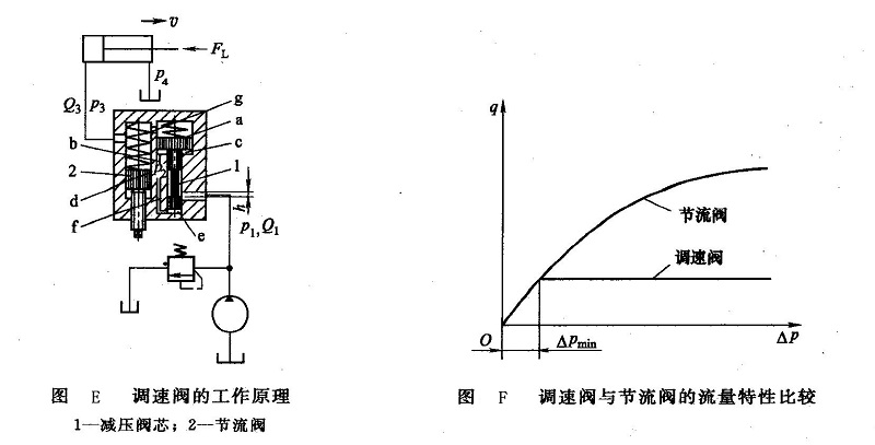 調(diào)速閥與節(jié)流閥的流量特性比較如圖F所示。由圖中曲線可以看出,節(jié)流閥的流量隨其進出口壓差的變化而變化;調(diào)速閥在其進出口壓差大于一定值后,流量基本不變。但在調(diào)速閥進出口壓差很小時,較小的壓差不能使調(diào)速閥中的減壓閥芯抬起,減壓閥芯在彈簧力的作用下處在最下端,減壓口全部打開,不起減壓作用,整個調(diào)速閥相當(dāng)于節(jié)流閥的結(jié)果,此時流量特性與節(jié)流閥相同(曲線重合部分)。所以要保證調(diào)速閥正常工作,應(yīng)使其進出口最小壓差△pmin >0.5MPa。