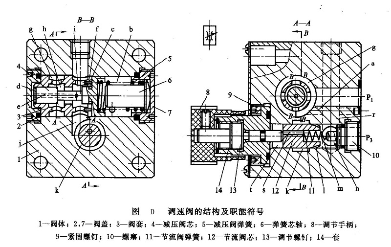 圖D所示為調(diào)速閥的結(jié)構(gòu)及職能符號。調(diào)速閥是由一減壓閥和一普通節(jié)流閥串聯(lián)而成的組合閥。
