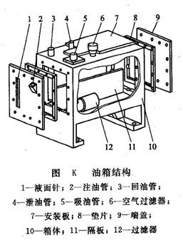 開式油箱的典型結(jié)構(gòu)如圖K所示。隔板11將吸油管5和回油管3、泄油管4隔開。頂部、側(cè)部及底部分別裝有空氣過濾器6、注油管2、液面針1以及過濾器12。安裝液壓泵及其驅(qū)動電動機(jī)的安裝板7可固定在油箱的頂面上。油箱的箱體10通常用2.5~5mm鋼板焊接而成。