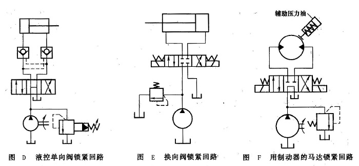 圖E所示為換向閥鎖緊回路。它是利用三位四通換向閥的中位機(jī)能(O型或M型)使活塞在行程范圍內(nèi)的任意位置上停止運(yùn)動(dòng)并鎖緊。但由于滑閥式換向閥的泄漏,這種鎖緊回路能保持執(zhí)行元件鎖緊的時(shí)間不長,鎖緊效果差。
