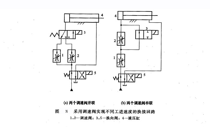 圖N所示為采用兩個調(diào)速閥來實現(xiàn)不同工進速度的換接回路。圖N(a)中的兩個調(diào)速閥并聯(lián),由電磁換向閥3實現(xiàn)速度換接。在圖示位置,電磁換向閥3處于左位,輸入液壓缸4的流量由調(diào)速閥1調(diào)節(jié)。當電磁換向閥3處于右位時,輸入液壓缸4的流量由調(diào)速閥2調(diào)節(jié)。
