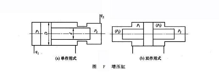 單作用增壓缸在小活塞運動到終點時,不能再輸出高壓液體,需要將活塞退回到左端位置,再向右行時才又輸出高壓液體,即只能在一次行程中輸出高壓液體。為了克服這一缺點,可采用雙作用增壓缸,如圖F(b)所示,由兩個高壓端連續(xù)向系統(tǒng)供油。