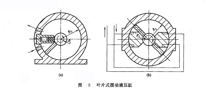 圖E(b)所示為雙葉片式擺動缸,它的擺動角度較小,可達150°,它的輸出轉(zhuǎn)矩是單葉片式的兩倍,而角速度則是單葉片式的一半。