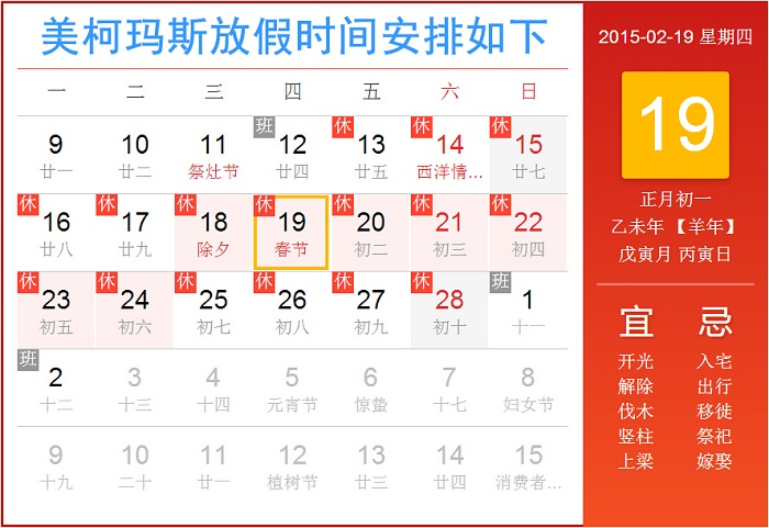 根據國務院辦公廳關于2015年春節(jié)放假安排時間的通知,并結合公司的實際情況,經研究決定,美柯瑪斯2015年春節(jié)放假安排相關事宜作如下安排: