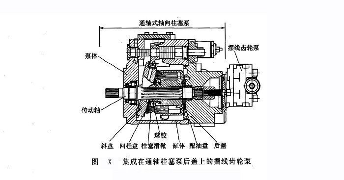 針齒環(huán)旋轉(zhuǎn)的擺線齒輪泵以體積小、價(jià)廉和自吸能力強(qiáng)的優(yōu)點(diǎn),除了用作某些輕載機(jī)床液壓系統(tǒng)的主泵外,特別廣泛地被集成在通軸柱塞泵的后蓋上(圖X),作為低壓補(bǔ)油泵或控制油源使用。此種泵一般可實(shí)現(xiàn)單向供油而與輸入轉(zhuǎn)向無關(guān),這一性能對于某些車輛或行走機(jī)械上需要用車輪驅(qū)動的應(yīng)急轉(zhuǎn)向、制動系統(tǒng)具有特殊的使用意義。
