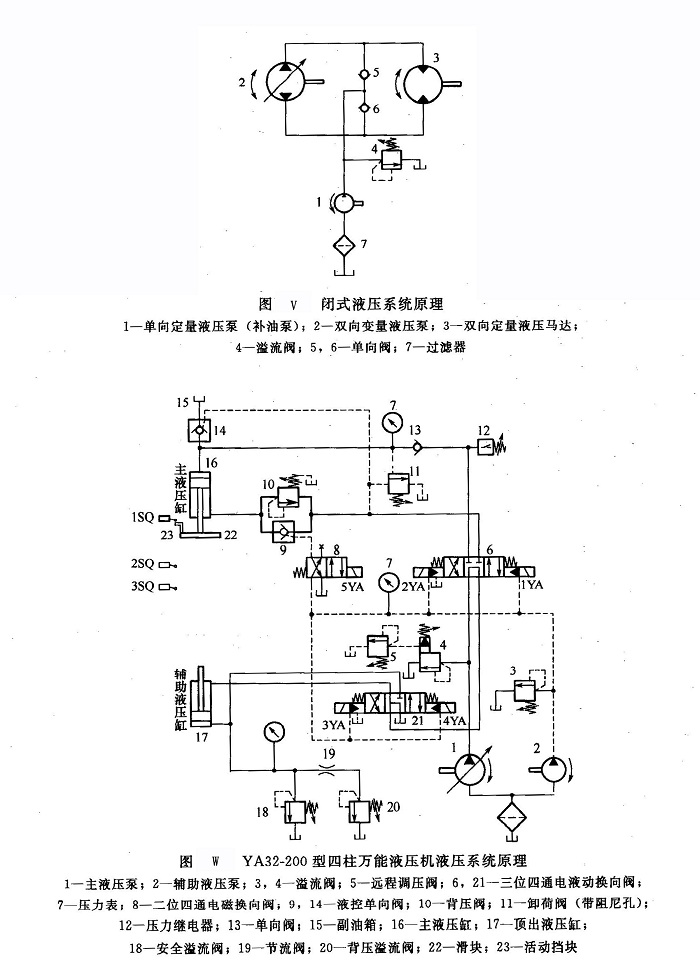 (1)應(yīng)用場合在各類液壓泵中,齒輪泵的工作壓力僅次于柱塞泵,且大部分齒輪泵采用鋁合金殼體、浮動軸套、雙金屬軸承、雙金屬固定側(cè)板等結(jié)構(gòu),具有結(jié)構(gòu)簡單、自吸能力強(qiáng)、重量輕、使用維護(hù)方便、能長期保持較高容積效率、價(jià)格低廉等特點(diǎn),常用作車輛與行走設(shè)備液壓系統(tǒng)的壓力能源和各種液壓系統(tǒng)的輔助泵,如閉式液壓系統(tǒng)中的補(bǔ)油泵、先導(dǎo)控制油路中的低壓控制油源等。圖V所示為一閉式液壓系統(tǒng),雙向變量液壓泵2和雙向定量液壓馬達(dá)3構(gòu)成閉式回路,單向定量液壓泵作為補(bǔ)油泵,可以通過單向閥5或6向系統(tǒng)補(bǔ)油,補(bǔ)油壓力由溢流閥4設(shè)定。圖W所示為YA32-200型四柱萬能液壓機(jī)的液壓系統(tǒng)原理,系統(tǒng)的主液壓泵l為高壓大流量壓力補(bǔ)償式恒功率變量柱塞泵,其最高工作壓力為32MPa,由遠(yuǎn)程調(diào)壓閥5設(shè)定,用作主液壓缸16和輔助(頂出)液壓缸17的油源。輔助液壓泵2為齒輪泵,主要用作電液換向閥6及21和液控單向閥9構(gòu)成的先導(dǎo)控制回路的低壓控制油源,其工作壓力由溢流閥3設(shè)定。