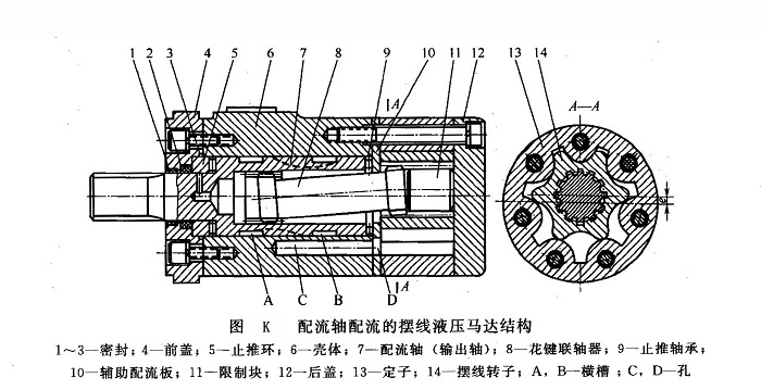 圖K所示為配流軸配流的擺線液壓馬達(dá)結(jié)構(gòu)。具有z1個(gè)齒的擺線轉(zhuǎn)子14與具有22個(gè)圓弧齒形的定子13相嚙合,形成z2個(gè)密閉容積。配流軸(輸出軸)7上的橫槽A、B與進(jìn)油口相通,配流軸表面均布有兩組縱向油槽2z1條,一組(z1條)與A相通,另一組(z1條)與B相通。殼體6中有22個(gè)孔C,這些孔經(jīng)過輔助配流板10的相應(yīng)22個(gè)孔D分別與定子的齒底相通(即分別與22個(gè)密封容積相通)。轉(zhuǎn)子在壓力油作用下,這些密封腔容積變大的部分通過配流軸通以高壓油,使馬達(dá)轉(zhuǎn)子旋轉(zhuǎn),再通過花鍵聯(lián)軸器8即將自轉(zhuǎn)傳遞給輸出軸。而另一些容積變小的密封腔通過配流機(jī)構(gòu)排出低壓油。如此循環(huán),液壓馬達(dá)連續(xù)工作,輸出轉(zhuǎn)矩和轉(zhuǎn)速。改變馬達(dá)的進(jìn)出油方向,則馬達(dá)輸出軸的旋轉(zhuǎn)方向也改變。這種馬達(dá)由于配流軸兼作輸出軸,故結(jié)構(gòu)簡單、外形尺寸小、重量輕、輸出轉(zhuǎn)速和轉(zhuǎn)矩的適應(yīng)范圍寬,效率通常比漸開線齒輪馬達(dá)高。但輸出軸在工作中難免要承受徑向力,徑向力使配流部分與殼體配合面偏心和磨損,將使容積效率下降。同時(shí),傳動(dòng)誤差也會(huì)影響配流精度。YMC-40型擺線馬達(dá)即為此種結(jié)構(gòu)。