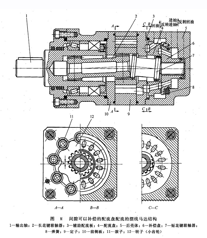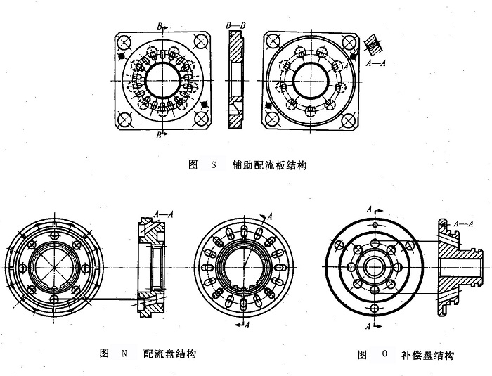 圖M所示為間隙可以補(bǔ)償?shù)呐淞鞅P配流的擺線馬達(dá)。圖S~圖O分別為該馬達(dá)中的輔助配流板、配流盤和補(bǔ)償盤的結(jié)構(gòu)。當(dāng)馬達(dá)通人壓力油后,轉(zhuǎn)子12在定子9內(nèi)既公轉(zhuǎn)又自轉(zhuǎn),其自轉(zhuǎn)運(yùn)動(dòng)一方面通過長花鍵聯(lián)軸器2傳給輸出軸1,另一方面又通過短花鍵聯(lián)軸器7帶動(dòng)配流盤4旋轉(zhuǎn)。配流盤4、補(bǔ)償盤6和輔助配流板3上的配流孔道的設(shè)置原理與圖K所示的擺線馬達(dá)中的配流軸、殼體配流孔及輔助配流板中配流孔道的設(shè)置原理相同。由于有這種連續(xù)的配流關(guān)系,所以馬達(dá)的轉(zhuǎn)子和輸出軸就能連續(xù)地旋轉(zhuǎn)。由于補(bǔ)償盤與配流盤之間以及配流盤與輔助配流板之間均具有當(dāng)前合理的壓緊系數(shù),所以這種馬達(dá)工作一段時(shí)間后,補(bǔ)償盤會(huì)自動(dòng)向左移動(dòng),以補(bǔ)償補(bǔ)償盤與配流盤之間、配流盤與輔助配流板之間的磨損,從而保持了較高的容積效率。