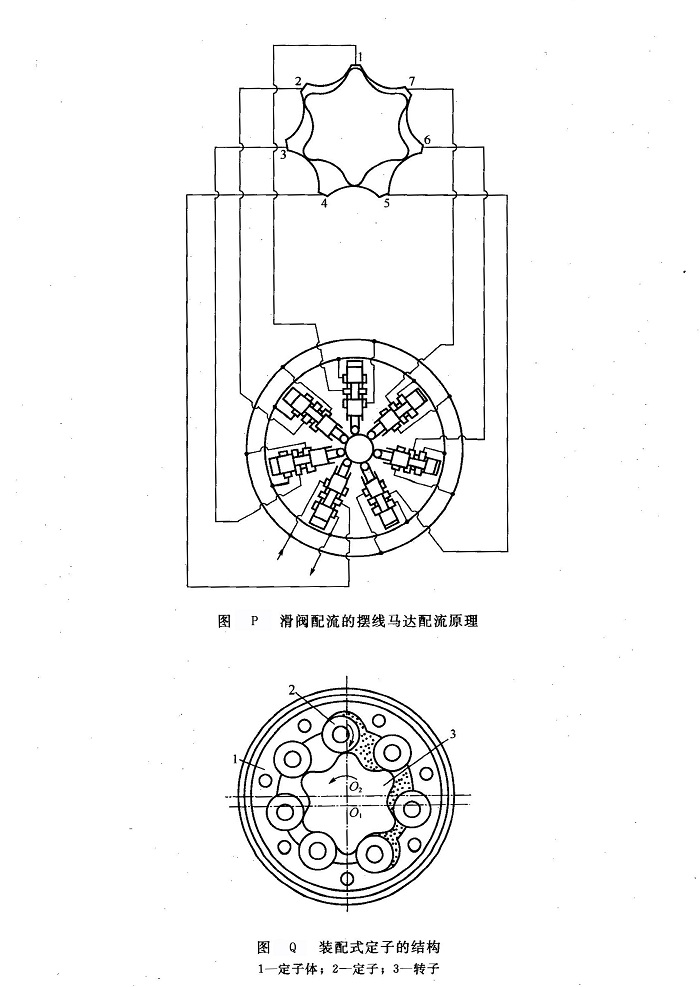 ③滑閥配流的擺線馬達(dá)滑閥配流是通過與輸出軸同步旋轉(zhuǎn)的偏心輪來操縱22個(gè)滑閥機(jī)構(gòu)(圖P)進(jìn)行連續(xù)的配流?;y配流的配流精度較高,可大大改善困油現(xiàn)象。采用這種配流方式的馬達(dá),機(jī)械效率高,噪聲低。工作壓力高,但結(jié)構(gòu)復(fù)雜,對濾油器過濾精度要求較高。