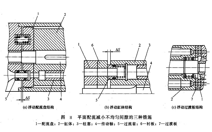 a.平面配流,由于配流盤與缸體的結(jié)合為平面,故稱平面配流。此結(jié)構(gòu)具有加工和維修方便、軸向能自動補償?shù)葍?yōu)點。因此中小排量的泵和馬達普遍采用此結(jié)構(gòu)。而對大排量的泵和馬達,在配流面處出現(xiàn)的不均勻間隙,則通常采取以下三種措施之一來彌補:一是采用浮動配流盤[圖H(a)],以配流盤1與過流套5的相對浮動進行自動補償,二是采用浮動缸體[圖H(b)],以缸體2與過流套5的相對浮動進行自動補償,此結(jié)構(gòu)與浮動配流盤比較,加工方便,易選擇壓緊比,但缸體運動慣性增大、自位性差、泵自吸性能受影響;三是采用浮動過渡板[圖H(c)],以過渡板7與缸體2的相對浮動進行自動補償,此結(jié)構(gòu)加工、維修方便,但補償量少。