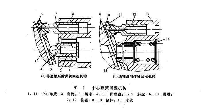 點(diǎn)接觸式泵的柱塞靠分散布置在每個(gè)柱塞底部的彈簧使柱塞外伸(回程),靠斜盤作用縮回,自吸能力較差,而且因彈簧高頻工作極易引起疲勞破壞,故此種結(jié)構(gòu)已很少采用。通常軸向柱塞泵采用圖J所示的中心彈簧回程機(jī)構(gòu),中心彈簧1的彈簧力通過套筒、鋼球或球鉸、回程盤帶動(dòng)滑履和柱塞回程,而靠斜盤強(qiáng)迫縮回,自吸能力較強(qiáng),而且在這種結(jié)構(gòu)中,彈簧承受靜載荷,其壓縮量不隨泵主動(dòng)軸的轉(zhuǎn)動(dòng)而變,故彈簧不會(huì)產(chǎn)生疲勞破壞。目前,這種結(jié)構(gòu)在軸向柱塞泵中被廣泛采用。