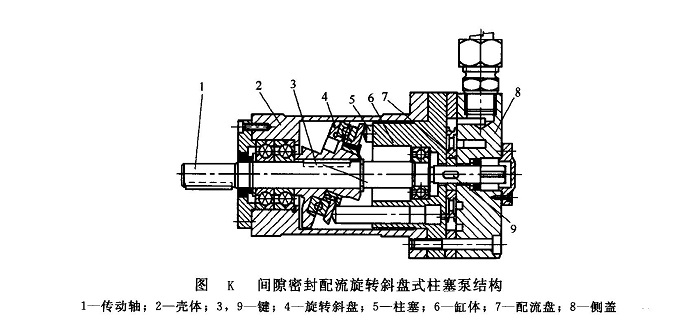 a.間隙密封配流式如圖K所示,傳動(dòng)軸1貫穿用鍵3、9與之相連的旋轉(zhuǎn)斜盤4和端面或圓柱配流盤7,傳動(dòng)軸旋轉(zhuǎn)時(shí)同時(shí)驅(qū)動(dòng)旋轉(zhuǎn)斜盤4和配流盤7。此種結(jié)構(gòu)由于需密封的滑動(dòng)面太多,故未見進(jìn)一步發(fā)展。