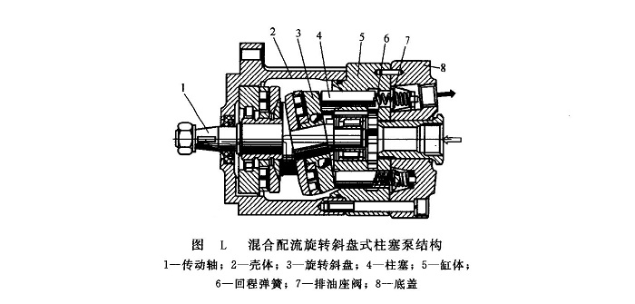 b.混合配流式現(xiàn)有旋轉(zhuǎn)斜盤式柱塞泵產(chǎn)品主要是滑閥、座閥或兩者混合配流。圖L所示泵的柱塞本身兼作吸油滑閥,當(dāng)柱塞4由回程彈簧6的彈性力頂著向外伸時(shí),底蓋8上對(duì)應(yīng)的排油座閥7由于腔內(nèi)油壓和自身彈簧的共同作用而關(guān)閉,缸筒下腔出現(xiàn)負(fù)壓,柱塞頂端的棱邊打開缸筒中部的吸油環(huán)槽時(shí),殼體2中的油液即會(huì)充入缸筒;而在旋轉(zhuǎn)斜盤3迫使柱塞下行并重新關(guān)閉了吸油環(huán)槽后,缸筒下腔中的油液即被壓縮,當(dāng)這部分油液的壓力和回程彈簧力的合力超過排油座閥另一側(cè)的諸力時(shí),此閥開啟,新的壓力油進(jìn)入排油腔。