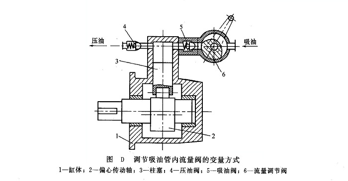 a.吸油管節(jié)流變量如圖D所示,吸油管節(jié)流變量是利用設(shè)在吸油管內(nèi)的流量調(diào)節(jié)閥(孔)6控制吸入量來(lái)調(diào)節(jié)輸出流量,此法結(jié)構(gòu)簡(jiǎn)單,功率損失不大,但輸出流量脈動(dòng)和噪聲較大。