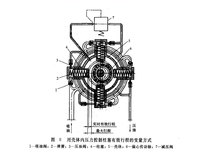 b.調(diào)節(jié)柱塞有效行程變量有力調(diào)節(jié)和位置調(diào)節(jié)兩種方式。對(duì)于彈簧回程的柱塞副,如圖E所示,利用彈簧2的彈性推力隨行程變化的特點(diǎn),通過(guò)調(diào)節(jié)在泵偏心傳動(dòng)軸6腔內(nèi)油液壓力來(lái)控制柱塞的實(shí)際回程量(在回程終點(diǎn)彈簧推力與作用于柱塞底面上的液壓力相平衡,柱塞底面與驅(qū)動(dòng)偏心滑道脫離并出現(xiàn)間隙)。