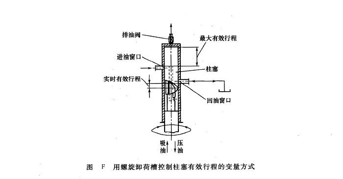 位置調(diào)節(jié)方式源于內(nèi)燃機(jī)的燃料噴射泵技術(shù),如圖F所示,它是在兼有吸油配流滑閥功能的柱塞上制出螺旋槽,當(dāng)通過(guò)某種機(jī)構(gòu)(齒輪齒條副等)使柱塞旋轉(zhuǎn)時(shí),即可利用此螺旋槽的密封棱邊與缸體內(nèi)固定的吸油窗口之間相對(duì)距離的變化,改變柱塞的有效吸油行程,進(jìn)而調(diào)節(jié)泵的流量。