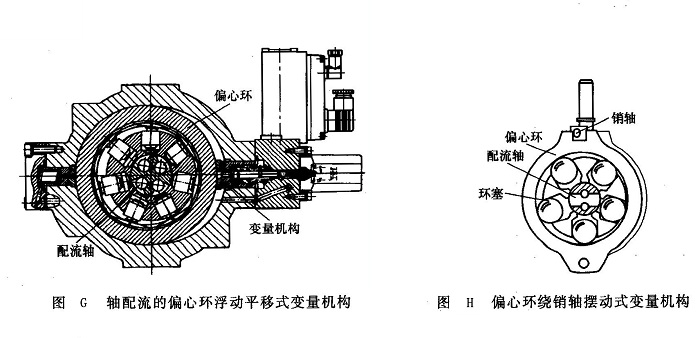b.偏心環(huán)繞銷軸擺動(dòng)式變量 圖H所示為鋼球作為柱塞的軸配流徑向變量柱塞泵,其變量機(jī)構(gòu)安裝在偏心環(huán)的切線方向上,使偏心環(huán)繞一根銷軸擺動(dòng)而變量。