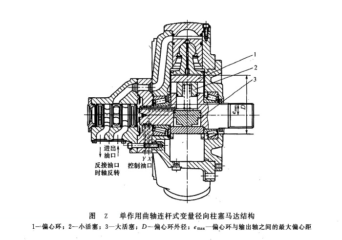 b.單作用曲軸連桿式變量徑向柱塞馬達 圖Z所示為該馬達結(jié)構(gòu)。通過改變偏心距使馬達變量。在曲軸上裝有小活塞2和大活塞3。當小活塞腔通入控制油、大活塞腔通回油時,小活塞在壓力油的作用下向上運動將偏心環(huán)1推至最大偏心位置,此時馬達排量和輸出轉(zhuǎn)矩最大,轉(zhuǎn)速最低。若通過換向閥改變位置,使大活塞腔通入控制油、小活塞腔通回油時,大活塞在壓力油的作用下向下運動將偏心環(huán)推至最小偏心位置,此時馬達為小排量,在供油量相同的情況下,輸出轉(zhuǎn)速提高,而輸出轉(zhuǎn)矩相應(yīng)降低。偏心距的改變可在馬達運轉(zhuǎn)中平穩(wěn)進行;可利用馬達本身壓力油作控制油,省去了控制油源;這種馬達可以和定量泵組合構(gòu)成容積調(diào)速回路,有效地實現(xiàn)恒功率調(diào)速。特別適合用于牽引絞車或驅(qū)動車輛的車輪。