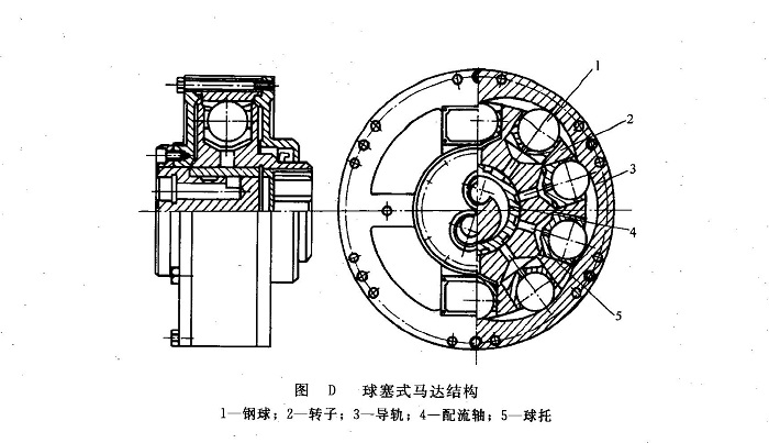 ①鋼球柱塞傳力式(球塞式)內曲線馬達 圖D所示為球塞式馬達結構。在轉子2上均布安裝多個鋼球1和球托5構成的球塞副,并通過球托傳力;馬達的配流機構為配流軸4。這種馬達的主要結構特點是:用鋼球和球托代替了一般徑向柱塞馬達上的柱塞或活塞與橫梁、滾輪等零件,因而結構簡單,成本低;由于鋼球是軸承廠大量生產的產品,供貨數(shù)量充足,精度高;運動副慣量小,鋼球結實可靠、耐沖擊,有利于提高轉速和在沖擊負載下連續(xù)工作;球塞副通過自潤滑復合材料制成的球托傳力,具有靜壓平衡和良好的潤滑條件,鋼球基本上無磨損;由于采用了可自動補償磨損的軟性塑料活塞環(huán)來密封高壓油,又提高了該馬達的液壓機械效率和容積效率,也改善了低速穩(wěn)定性和增大了啟動轉矩。由于配流軸4與定子為剛性連接,該馬達的進出油口允許用鋼管連接。