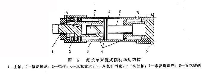 ②細(xì)長(zhǎng)單來(lái)復(fù)式擺動(dòng)馬達(dá)(圖E) 這是一種用于臺(tái)車(chē)鉆臂上翻轉(zhuǎn)鑿巖機(jī)滑道的單來(lái)復(fù)式擺動(dòng)馬達(dá)。其活塞5上的來(lái)復(fù)桿與主軸1上的來(lái)復(fù)螺旋副相配,主軸又與滑道相連,殼體3通過(guò)法蘭軸6固定于鉆臂上。當(dāng)壓力油從油口A進(jìn)入殼體左腔時(shí),活塞沿著直花鍵副8向右運(yùn)動(dòng)。由于鉆臂不動(dòng),所以活塞直線運(yùn)動(dòng)時(shí),通過(guò)來(lái)復(fù)螺旋副7迫使主軸連同滑道一起旋轉(zhuǎn)。反之,壓力油由B油口進(jìn)入時(shí),滑道就反轉(zhuǎn)。這種馬達(dá)的優(yōu)點(diǎn)是能帶動(dòng)細(xì)長(zhǎng)工作機(jī)構(gòu)旋轉(zhuǎn)。