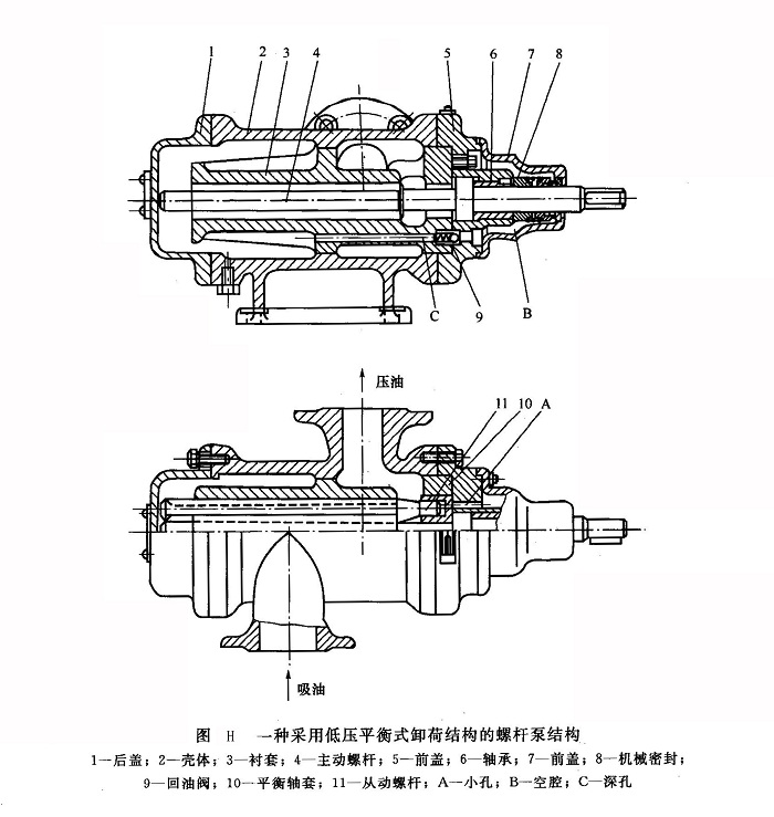 圖H所示為采用低壓平衡式卸荷結(jié)構(gòu)的螺桿泵結(jié)構(gòu)。處于高壓腔的螺桿平衡活塞的端部腔室經(jīng)小孔A、前蓋7的空腔B、回油閥9、襯套深孔C與低壓腔相通,使螺桿的軸向力得到平衡。其中回油閥9的作用是使平衡活塞的端部腔室及空腔B保持較小的背壓,以免該處和吸油腔一樣處于真空狀態(tài),使該處滑動(dòng)軸承的潤滑油膜遭到破壞。