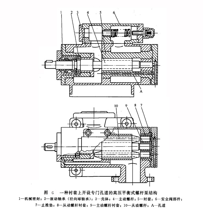 圖G所示為一種襯套上開設(shè)專門孔道的高壓平衡式三螺桿的螺桿泵結(jié)構(gòu)。外套上開設(shè)的專門孔道A將高壓腔的液體引入螺桿底部的平衡活塞處。主動(dòng)螺桿4從高壓腔伸出,通過徑向球軸承2支承,以承受主動(dòng)螺桿剩余軸向力和固定其位置。在主動(dòng)螺桿高壓端設(shè)有直徑較大的臺肩,還采用了高壓止推軸承卸荷結(jié)構(gòu)。