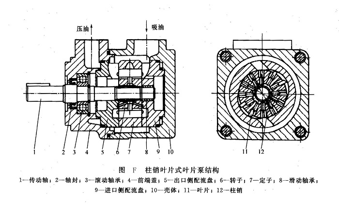 (1)主要結(jié)構(gòu) 葉片泵也屬于殼體承壓型液壓元件,高性能葉片泵的代表性產(chǎn)品有子母葉片式、柱銷葉片式、雙葉片式、階梯葉片式等,其中柱銷葉片式葉片泵的加工工藝最為復(fù)雜,且能包括其他各種泵的加工工藝,故此處以柱銷葉片式葉片泵為主介紹其關(guān)鍵零件的材料及工藝。圖F所示為一種柱銷葉片式葉片泵結(jié)構(gòu),它主要由轉(zhuǎn)子6、定子7、葉片11、兩側(cè)配流盤5和9、傳動(dòng)軸1及殼體10等關(guān)鍵零件組成。借助由定子內(nèi)表面、轉(zhuǎn)子外表面、裝在轉(zhuǎn)子葉片槽中的兩相鄰葉片和進(jìn)、出口兩側(cè)的配流盤端面所形成的密閉工作容積的變化,即可實(shí)現(xiàn)吸油和壓油。