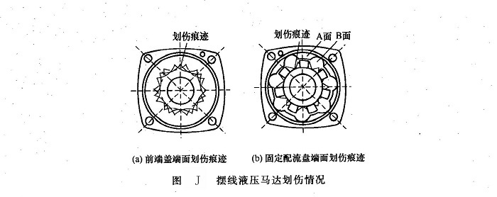 ②原因分析拆檢發(fā)現(xiàn),與馬達(dá)定子、轉(zhuǎn)子端面相接觸的前端蓋端面上和固定配流盤端面上分別有3道七邊形波紋狀的明顯劃傷痕跡。前端蓋端面上的劃傷情況較輕,劃傷深度較淺[圖J(a) ];固定配流盤端面劃傷較重,劃傷深度為0.1~0.2mm、寬度為0.1~0.3mm[圖J(b)],由于前端蓋端面及配流盤端面劃傷后,將使馬達(dá)七個(gè)封閉油腔相互串通,造成馬達(dá)內(nèi)泄漏嚴(yán)重,從而嚴(yán)重影響馬達(dá)輸出轉(zhuǎn)矩,在工作中表現(xiàn)為馬達(dá)工作無力。由于該機(jī)工作條件十分惡劣,作業(yè)對(duì)象是水泥砂石,又缺乏必要的防塵措施,使液壓油嚴(yán)重污染,造成馬達(dá)端面運(yùn)動(dòng)副磨損劃傷,這是主要原因。