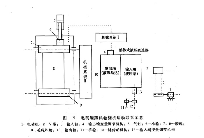 ①功能、結(jié)構(gòu)及故障現(xiàn)象毛呢罐蒸機(jī)是從英國(guó)Saler公司引進(jìn)的一種紡織設(shè)備,由卷繞機(jī)和罐蒸器兩部分組成,用于毛呢織物的卷繞和罐蒸,以提高產(chǎn)品美觀度:卷繞機(jī)由一整體式液壓變速器驅(qū)動(dòng)和控制(圖N),其主要功能是將經(jīng)剪絨之后卷在膠輥9上的毛呢織物均勻地卷繞到膠輥7上。按卷繞工藝,要求該液壓變速器能通過(guò)由齒輪、同歲齒形帶等機(jī)構(gòu)零件組成的機(jī)械系統(tǒng)Ⅱ正、反向啟動(dòng)膠輥9及7,且能通過(guò)該變速器輸入和輸出端的變量調(diào)節(jié)機(jī)構(gòu)使兩個(gè)膠輥的轉(zhuǎn)速?gòu)?span lang="EN-US">0~1500r/min得到無(wú)級(jí)調(diào)節(jié),同時(shí)還能通過(guò)起反饋?zhàn)饔玫臋C(jī)械系統(tǒng)I與氣缸5及小輪6的配合,使兩個(gè)膠輥之間的織物的線速度基本恒定,以保證適當(dāng)張力,實(shí)現(xiàn)均勻卷繞。