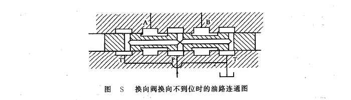 進(jìn)油腔P通過閥芯中心通道,與兩端回油腔相通,即P-T通,液壓泵卸荷,通往液壓缸的A、B兩油口都封閉。如果換向閥閥芯換向不到位,則可能出現(xiàn)如圖S所示的情況,導(dǎo)致發(fā)生以下故障。